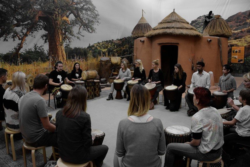 Zdjęcie wykonane podczas warsztatów gry na bębnach, zorganizowanych w Muzeum Narodowym w Szczecinie w ramach Ogólnopolskich Dni Djembe. Warsztaty prowadził Paweł Sasim (AFROBANDA ODD SZCZECIN)